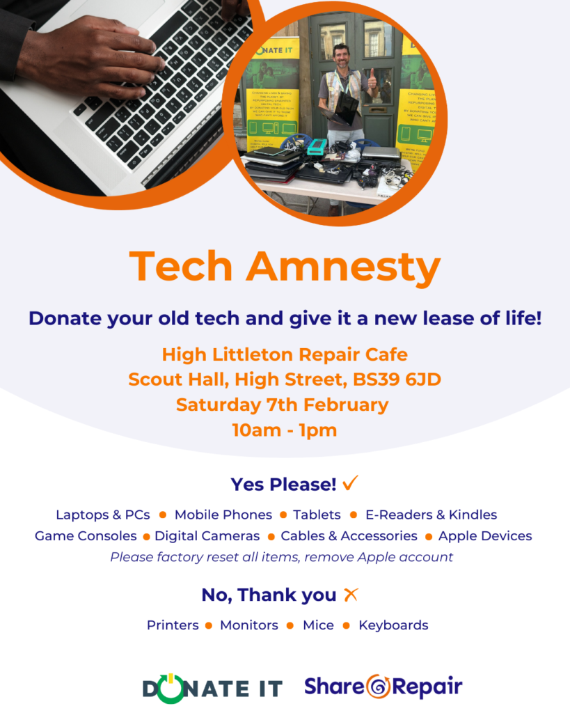 The next Tech Amnesty will be at High Littleton Repair Cafe on Saturday the 7th of February. Bring along your devices and check the image below for the full list of items that can be accepted.